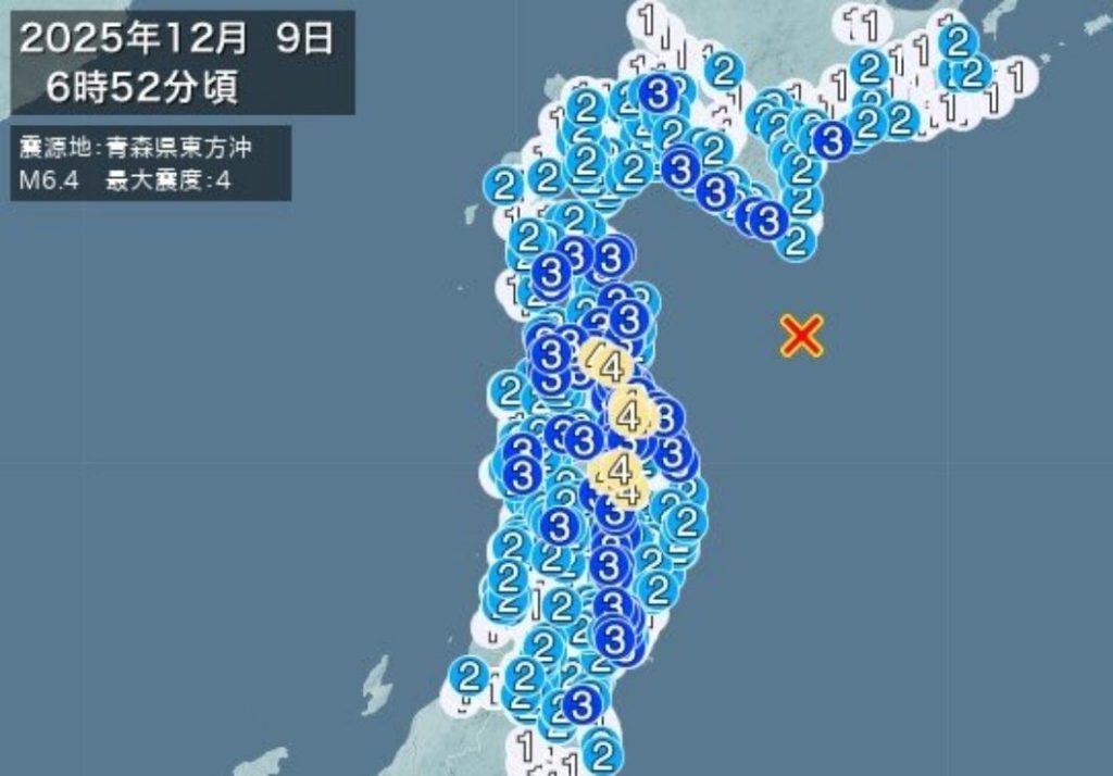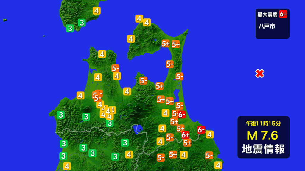 昨夜23時15分頃、青森県沖を震源に震度6強の地震があったと? (◎-◎;)