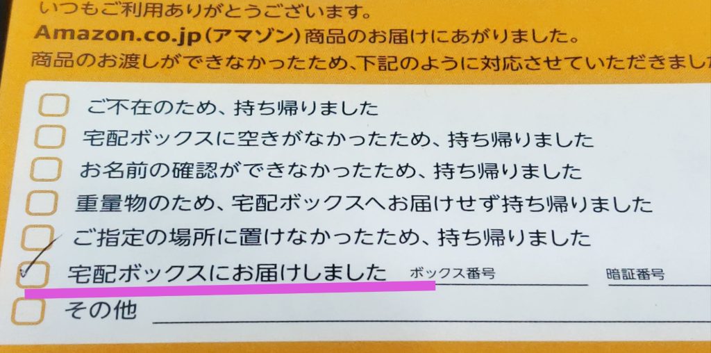 いったのです。 設定で「置き配を利用しない」ってしたのに上に置いた