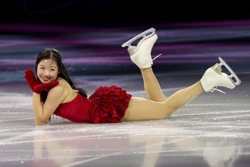 新しいフィギュアの女王がオリンピックのエキシビションで氷上でうつ伏せに